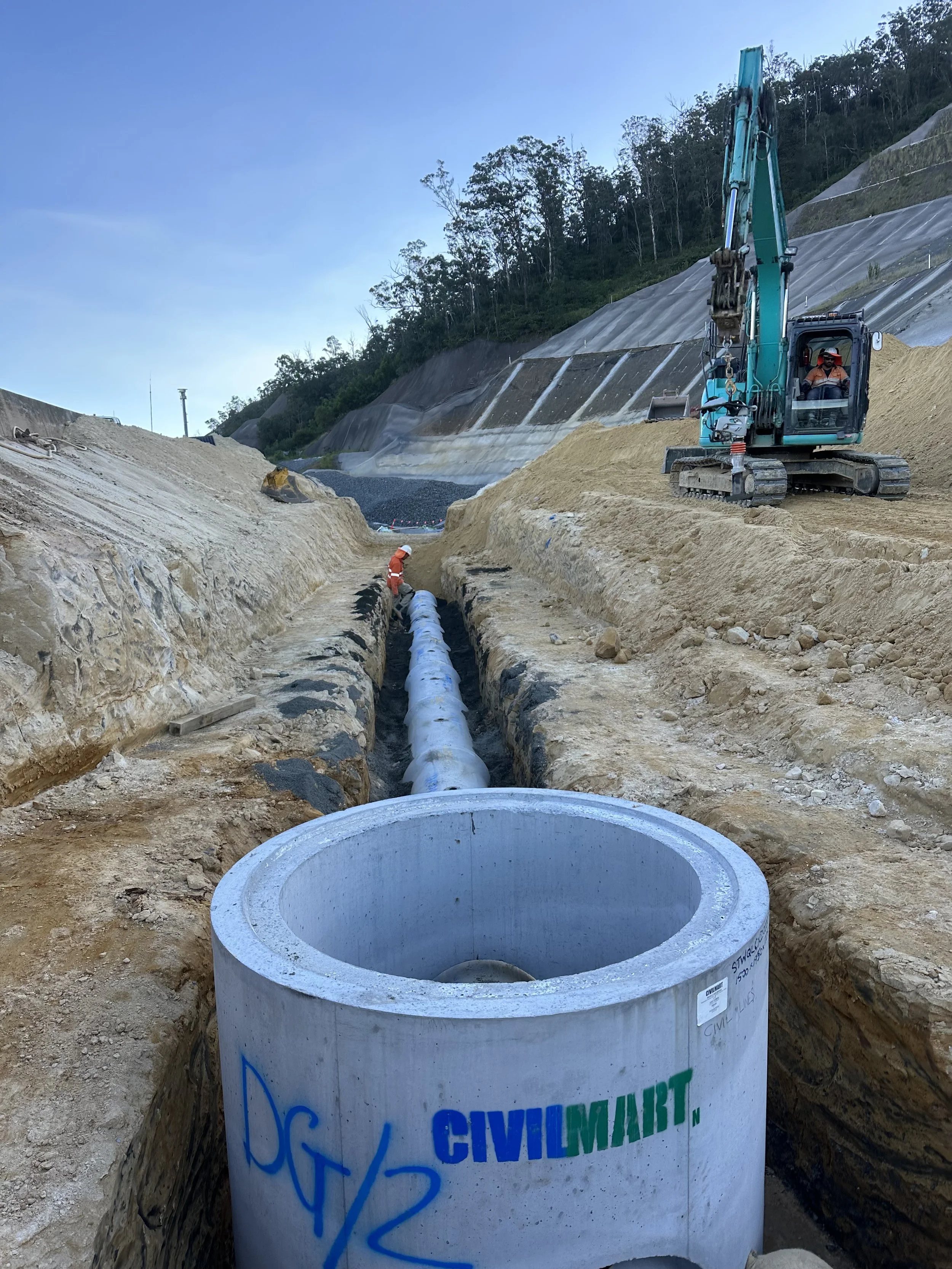 Civil Lines successfully delivered a technically detailed stormwater infrastructure project for ACCIONA Infrastructure Australia Pty Ltd and Ferrovial Agroman (Australia) Pty Ltd as part of the Nexus Delivery works in Queensland. The scope included the installation of 600 metres of DN600 RCP stormwater pipe, four 1200mm stormwater pits, and 36 subsoil drains beneath a rock buttress—executed under strict geotechnical and environmental controls.